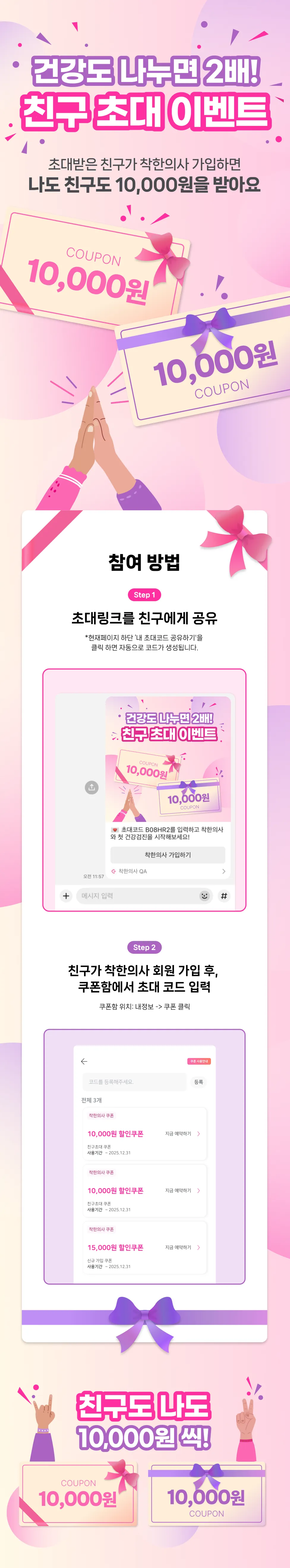 친구 초대 서비스 및 리워드는 착한의사의 사정에 의해 사전 고지 없이 동일한 가치의 다른 리워드로 지급, 변경, 종료될 수 있습니다. 종료 이후에는 리워드가 지급되지 않습니다.